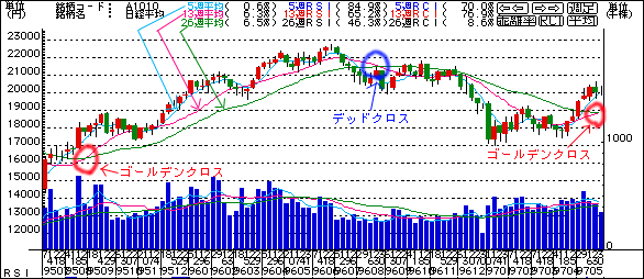 下の日経平均の例でもよくわかりますが、13週移動平均線が26週移動平均線を下から上に突き抜けるとゴールデンクロス(買いタイミング)、反対をデッドクロス(売りタイミング)といい売買の大きな指標の一つされています。